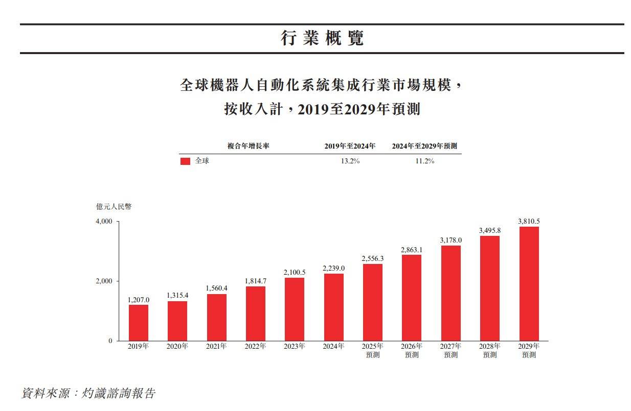 正在全球工业4。0和智能制制历程不竭推进的布景下,全球制制业对机械人和从动化的投入持续提拔。全球机械人从动化系统集成市场规模由2019年的约1,207。0亿元增加至2024年的约2,239。0亿元,复合年增加率为13。2%。