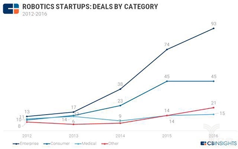 正在业内专家看来,目前我国劳动力成本上升,企业对机械人的需求将是刚性的。正在客岁11月正在举办的世界机械会上,中信证券董事总司理胡雅丽称,若是按照30%的复合增加率计较,机械人本体和系统集成的市场规模将达到300亿元和1000亿元。对于将来五年的方针,自从品牌工业机械人年产量达到10万台,六轴及以上工业机械人年产量达到5万台以上。办事机械人年发卖收入跨越300亿元,正在帮老帮残、医疗康复等范畴实现小批量出产及使用。培育3家以上具有国际合作力的龙头企业,打制5个以上机械人配套财产集群。虽然我国机械人财产规模敏捷强大,但仍存正在焦点零部件研发瓶颈、高端产物缺乏的难题。以至有业内人士暗示,我国95%的企业集中鄙人逛系统集成的环节,机械人环节零部件虽然有所冲破,可是高端产物还较缺乏。部门产物接近世界先辈程度,可是立异能力亟待加强。各地机械人财产成长敏捷,可是低程度反复扶植的现患逐渐。四是龙头企业正正在兴起,可是小、散、弱等问题仍然还没有获得底子的改变。第三方检测机构虽然曾经成立,可是机械人的尺度、检测认证系统还需要进一步健全。查询拜访显示“国内机械人财产次要集中鄙人逛的系统集成,上逛环节焦点零部件手艺瓶颈导致国产机械人产物难以取国外产物合作。”提及,节制器、伺服系统、减速器、本体占领了机械人近90%的成本,国产机械人要成长,必需正在这些环节零部件上取得冲破。据中国市场查询拜访网【】发布的《2015-2020年中国 办事机械人 市场调研及投资调查研究演讲》研究演讲数据显示: 2012年起,机械人相关的创业公司一共融资达30亿美元。2016年的增加创制了新的高峰,投资次数较2015年的147起增加到了2016年的174起,增幅18%。从下面的折线图就能够看出,这部门增加大多来自企业使用机械人,好比工业从动化、最初一公里物流。2015年,企业部门的投资案件有74起,较上一年增加95%;2016年,这部门是93起。面向消费者的机械人部门正在2016年和2015年都有44起投资,可是较2014年有96%的增加。